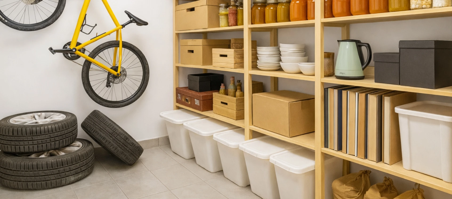 ✓ Все под рукой. Не нужно ехать в гараж на другом конце города. Спустился в цокольный этаж — забрал лыжи или сезонную обувь.