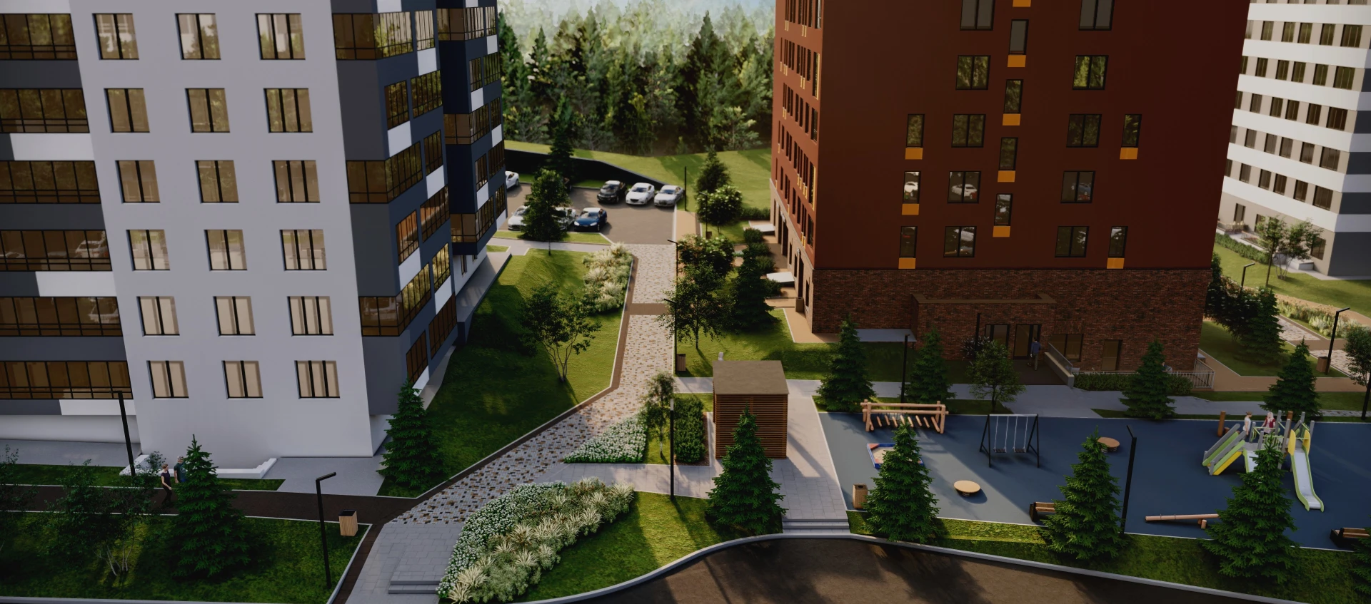 Здания разной высотности образуют полузамкнутый квартал с доступом естественного света на все этажи. Продуманные маршруты, разноплановое озеленение, соседство с вековыми соснами — все это делает проект островком спокойствия в оживленном городе с отличными перспективами не только на жизнь, но и на доход.
