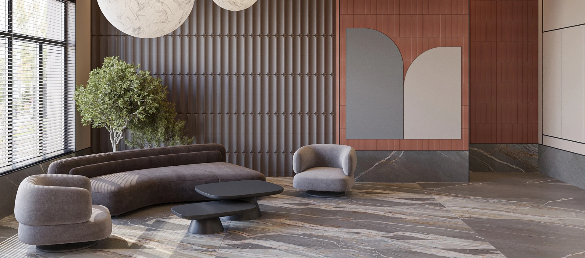 Дизайнерское освещение, включая встроенные светильники и акцентные люстры, наполняет пространство мягким светом. Во входной зоне предусмотрены места ожидания с мягкой мебелью.